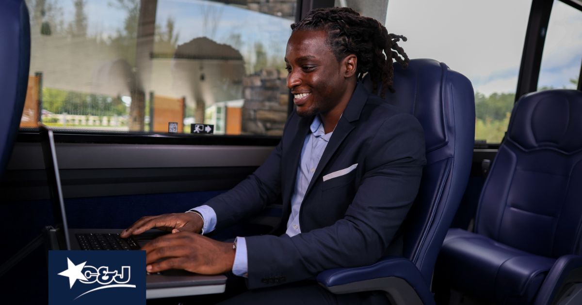 C&J isn’t just transportation—it’s your mobile office on wheels. Designed with professionals in mind, every bus is equipped to keep you focused, refreshed, and connected: